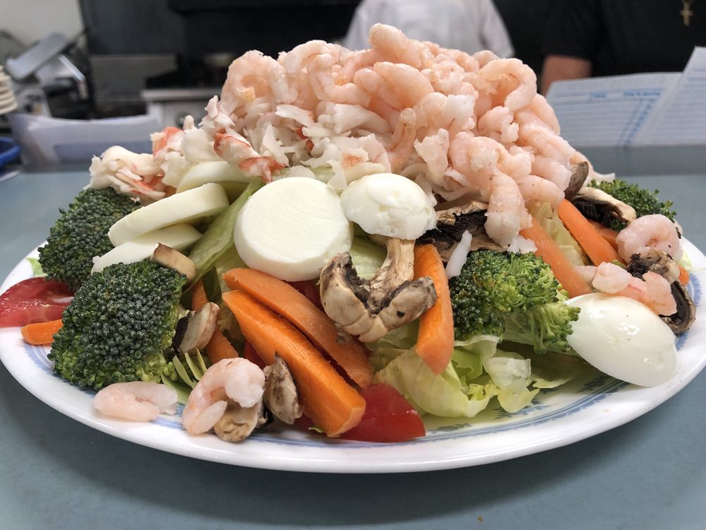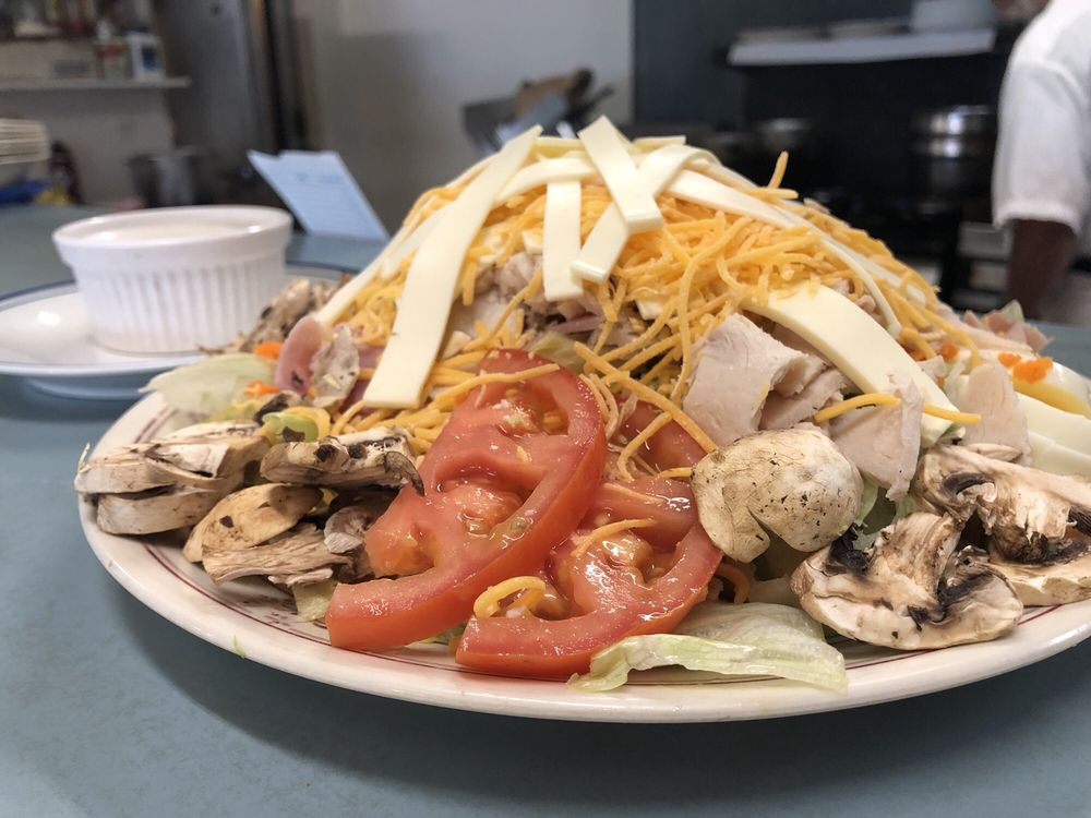 Turkey, ham, hard boiled eggs, cheese, tomatoes and onions.